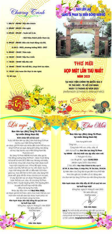 Xin kính gửi Quý Bà Con Làng Tả Phan về thư mời họp mặt đầu năm Quý Mão năm 2023.